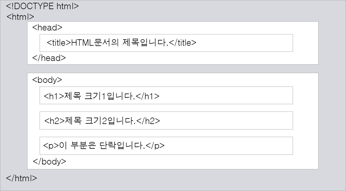 HTML 기본 구조 다음은 HTML 문서의 기본적인 구조를 보여주는 그림입니다. : 현재 문서가 HTML5 문서임을 명시합니다. : HTML 문서의 루트(root) 요소를 정의합니다. : HTML 문서의 메타데이터(metadata)를 정의합니다. - 메타데이터(metadata)란 HTML 문서에 대한 정보(data)로 웹 브라우저에는 직접적으로 표현되지 않는 정보를 의미합니다. - 이러한 메타데이터는 , , , , , 태그 등을 이용하여 표현할 수 있습니다. : HTML 문서의 제목(title)을 정의하며, 다음과 같은 용도로 사용됩니다. - 웹 브라우저의 툴바(toolbar)에 표시됩니다. - 웹 브라우저의 즐겨찾기(favorites)에 추가할 때 즐겨찾기의 제목이 됩니다. - 검색 엔진의 결과 페이지..